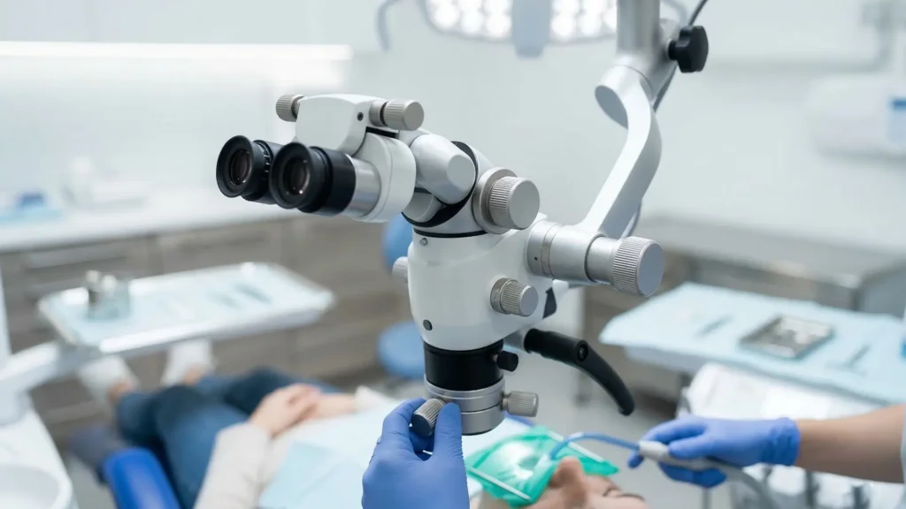 يتيح الميكروسكوب الطبي رؤية القنوات الجذرية بتكبير عالي يساعد الطبيب على اكتشاف القنوات الدقيقة أو المخفية التي قد لا تكون مرئية بالعين المجردة.